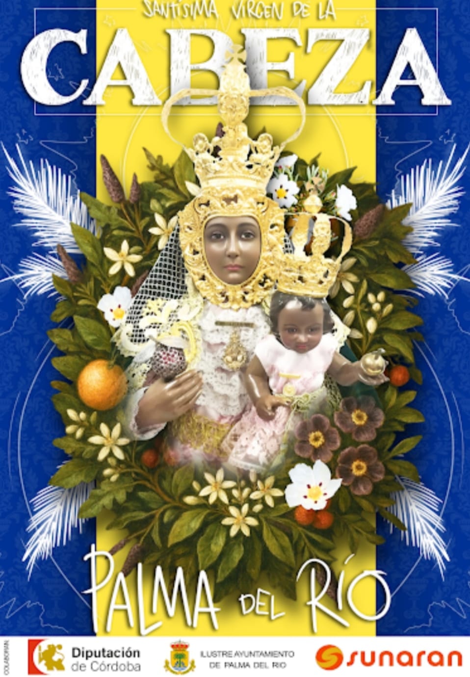 En el centro, se representa la imagen de la Virgen de la Cabeza, ricamente ataviada y rodeada por una corona floral o vergel, que actúa como un marco vegetal evocador del concepto de «jardín místico». Esta composición floral está formada por especies autóctonas de la flora de Sierra Morena, reforzando el vínculo natural y espiritual que une a la Virgen con su entorno serrano. Entre la vegetación destacan la naranja y el azahar, símbolos profundamente ligados a Palma del Río, ciudad cordobesa reconocida por la fertilidad de sus huertas y su tradición citrícola, tanto a nivel nacional como internacional.