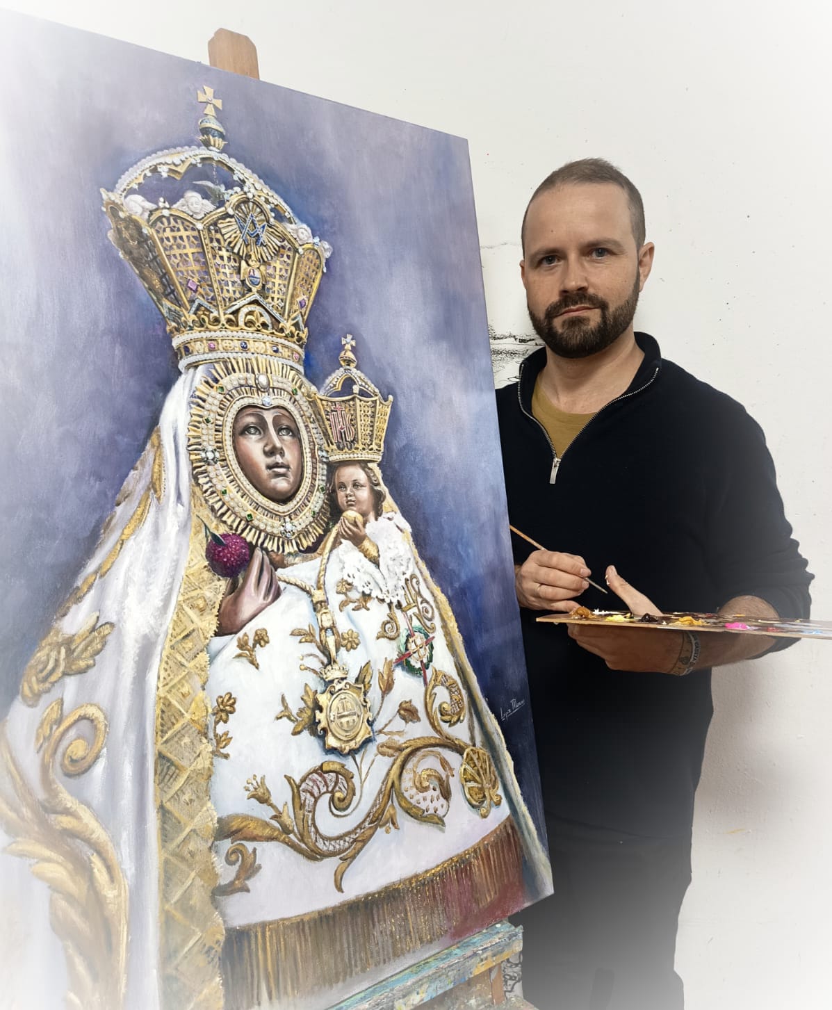 Palma del Río tampoco le es ajena: en 2018 realizó el cartel de Nuestra Señora de la Cabeza, la pintura del estandarte corporativo de su hermandad y pronunció el pregón de romería, reconocimiento que lo hizo merecedor del título de Moreno del Año.