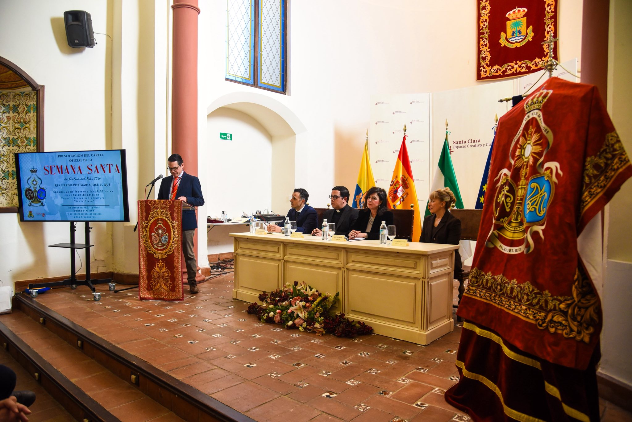 El salón de actos del espacio creativo y cultural «Santa Clara» de Palma del Río acogió en la tarde del sábado 21 de febrero el acto de presentación del Cartel Oficial de la Semana Santa de Palma del Río 2026, un acto que reunió a autoridades, cofrades y numerosos fieles.