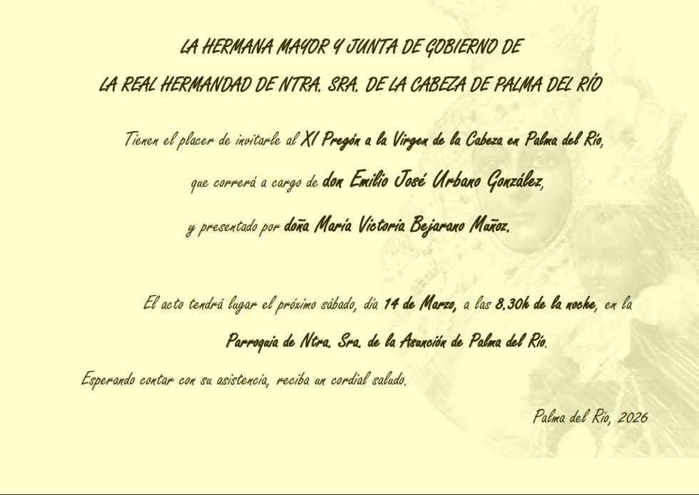 - La Real Hermandad de la Virgen de la Cabeza de Palma del Río celebrará el 14 de marzo el XI Pregón en la Parroquia de Nuestra Señora de la Asunción de Palma del Río.